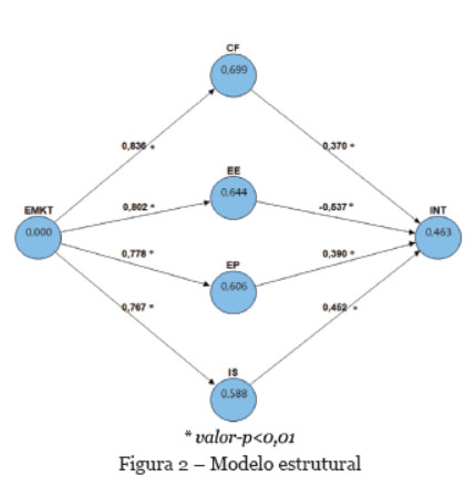O modelo estrutural, exposto na Figura 2, foi avaliado pelo sinal, magnitude e significância estatística dos parâmetros das relações estruturais, assim como pela variância explicada (R2) das variáveis latentes endógenas (Götz et al., 2010). Com exceção da relação EE?INT, todas as restantes têm parâmetros com sinal compatível (positivo) com o previsto no modelo de investigação e são estatisticamente significativas ao nível de 1%, o que permite confirmar todas as hipóteses exceto H2. Os resultados indicam que a variação da intenção de utilização é explicada em 46,3% pela variação das condições facilitadoras, expectativa de esforço, expectativa de performance e influência social. Por outro lado, os esforços de marketing explicam 69,9%, 64,4%, 60,6% e 58,8% da variação das condições facilitadoras, expectativa de esforço, expectativa de performance e influência social, respetivamente.