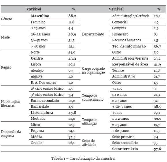 O estudo empírico teve por base uma amostra não-aleatória, de conveniência, constituída por 203 clientes empresariais da PT-Empresas, que são utilizadores de serviços cloud computing. Em cada empresa, foi inquirido o responsável pelo setor de TI. De acordo com a Tabela 1, os inquiridos são maioritariamente do género masculino (88,2%), têm idades entre os 26 e os 35 anos (38,9%) e habilitações literárias ao nível da licenciatura (45,8%). A maioria trabalha em empresas de média dimensão (34,0%), da região Centro (43,3%), do setor terciário (56,7%), no departamento de TI (56,7%) e são responsáveis de área (41,9%). A maior parte dos inquiridos refere conhecer os serviços cloud computing há mais de 3 anos (38,9%), mas utiliza-os há mais de um e há menos de dois anos (39,9%).