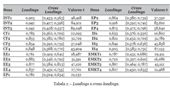 O modelo de medida foi avaliado em termos de fiabilidade, validade convergente e validade discriminante. A Tabela 2 apresenta os loadings, os cross-loadings e os valores-t dos indicadores de medida. Os valores-t foram obtidos através de bootstraping com 5000 iterações, indicando que todos os loadings são estatisticamente significativos ao nível de 1%. Todos os itens têm loadings acima do valor mínimo de 0,7 (Götz, Liehr-Gobbers, & Krafft, 2010), com exceção do item IS1. Atendendo a que este loading fica relativamente próximo do ponto de corte e a escala não apresenta problemas de fiabilidade, decidimos manter o item na análise subsequente. Estes resultados dão suporte à fiabilidade dos indicadores de medida.