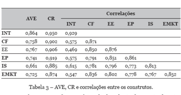 A Tabela 3 descreve a variância média extraída (AVE), a fiabilidade compósita (CR) e as correlações de cada variável latente. Os valores da CR são maiores do que o valor mínimo recomendado de 0,6 (Götz et al., 2010), variando entre 0,874 e 0,950, o que nos permite concluir que todos os construtos têm adequada consistência interna. Para além disso, a AVE de todos os construtos é maior do que o ponto de corte mínimo de 0,5 (Götz et al., 2010), o que assegura a sua validade convergente. Finalmente, de acordo com o critério de Fornell-Larcker, a validade discriminante foi obtida para cada construto, dado que a raiz quadrada da sua AVE é maior do que o valor absoluto das correlações com os restantes construtos (Fornell & Larcker, 1981). Para além disso, de acordo com a Tabela 3, os cross-loadings são maiores que os loadings em cada item, o que reforça a validade discriminante (Götz et al., 2010).