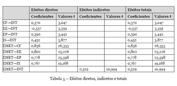 A Tabela 5 mostra os efeitos diretos, indiretos e totais entre as variáveis do modelo. A intenção de utilização é influenciada diretamente pelas condições facilitadoras, expectativa de esforço, expectativa de performance e influência social, e indiretamente pelos esforços de marketing. Por seu turno, esta última variável influencia diretamente as condições facilitadoras, expetativa de esforço, expectativa de performance e influência social. Todos os efeitos diretos, indiretos e totais são estatisticamente significativos ao nível de 0,1%. Os esforços de marketing exercem o efeito direto mais forte sobre as condições facilitadoras (ß=0,836), enquanto que é à influência social que cabe o maior efeito direto sobre a intenção de utilização (ß=0,452). O único efeito indireto é exercido pelos esforços de marketing sobre a intenção de utilização (ß=0,529). Com exceção do efeito total dos esforços de marketing na intenção de utilização, que se deve exclusivamente ao efeito indireto, todos os restantes efeitos totais são coincidentes com os efeitos diretos. A importância dos esforços de marketing no modelo proposto é evidente, já que esta variável é a responsável pelo maior efeito total sobre a intenção de utilização (ß=0,529).