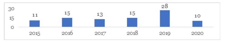 A partir desse recorte, foi possível fazer uma análise mais acurada dos trabalhos publicados que envolvem a temática, notadamente nas áreas de Comunicação, Ciência da Informação e Computação. Embora em 2017 tenha havido um decrescimento; de 2015 ao primeiro quadrimestre de 2020, observa-se aumento das publicações relacionadas à temática comunicação/relações públicas e plataformas digitais (Gráfico 1), totalizando 92 artigos no período.
