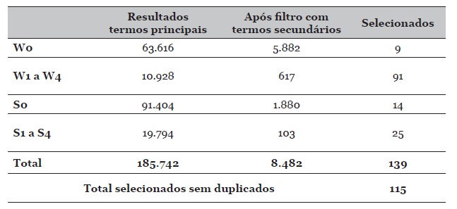 Cada conjunto acima foi relacionado, posteriormente e separadamente, com cada um dos seguintes termos: digital platform*; digital technolog*; information system*. Somadas todas as rodadas de buscas apenas dos termos principais, detectaram-se mais 185 mil artigos. A Tabela 1 consolida os quantitativos de cada conjunto de pesquisa e demonstra um total de 115 selecionados após a exclusão de trabalhos duplicados. Verifica-se que a base de Web of Science reúne 72% do número de publicações relacionadas à comunicação e às plataformas digitais. Apenas quatro artigos foram identificados em língua portuguesa, representando os conjuntos W4 e S4.