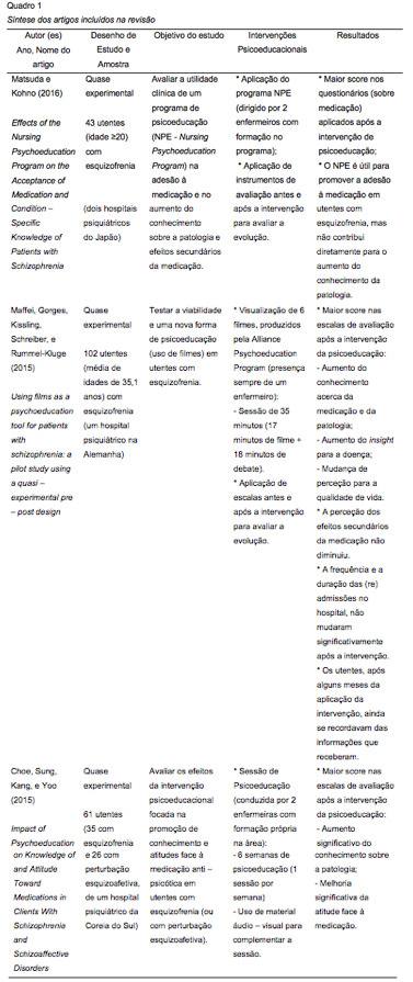 RESULTADOS:Foram identificados 15 artigos e após a aplicação dos critérios de inclusão previamente definidos, foram selecionados três estudos para análise final. As intervenções realizadas nesses estudos foram: a aplicação do Nursing Psychoeducation Program; a visualização de filmes produzidos pela Alliance Psychoeducation Program e a realização de sessões de psicoeducação (com role – play). Em todas elas, usando medidas específicas antes e após as intervenções psicoeducacionais, verificou-se um aumento do conhecimento sobre a perturbação mental e uma mudança de atitude face à adesão ao regime medicamentoso.