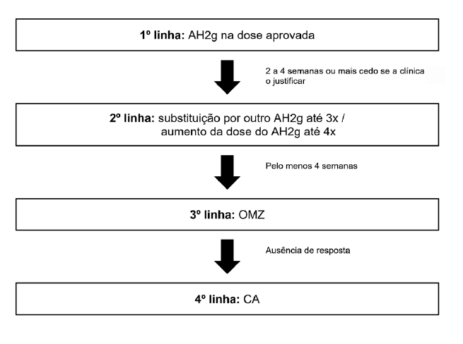 AH2g: anti-histamínicos H1 de segunda geração; OMZ: omalizumab; CA: ciclosporina