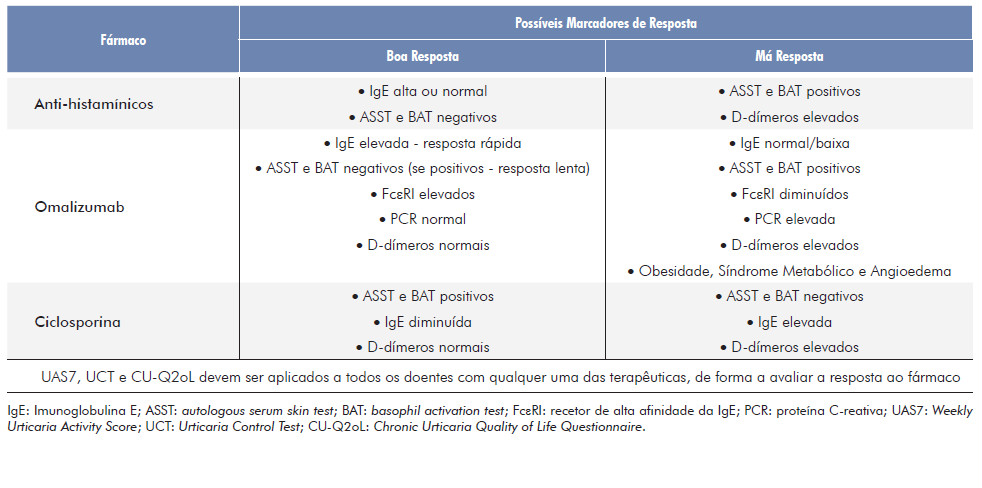 Com esta estratificação de doentes verificou-se que aqueles que apresentam uma aparente fisiopatologia autoimune revelam fraca resposta aos AH2g, contrariamente ao que ocorre com o OMZ e CA. Doentes com um ASST e BAT positivos, associados a níveismais baixos de IgE e níveis mais altos de PCR, representando um subtipo de autoimunidade tipo IIb, apresentam uma resposta desfavorável aos AH2g, respondem favoravelmente à CA e tendem a responder ao OMZ, apesar de tal ocorrer mais tardiamente (após 4-6 meses). Os doentes que apresentam níveis mais altos de IgE e que frequentemente têm o ASST e o BAT negativos, representando uma forma imunológica com IgE anti-self (autoimunidade tipo I ou autoalérgica), revelam uma resposta favorável e rápida ao OMZ, ainda que com uma recidiva mais rápida após a sua suspensão, e uma resposta desfavorável à CA. Por último, doentes que não apresentam qualquer indício de base autoimune, ou seja, com ASST e BAT negativos, IgE com valores normais ou baixos e PCR normal, revelam uma resposta favorável aos AH2g, poderão responder à CA e muito provavelmente vão ser resistentes ao OMZ. Os D-dímeros, quando elevados, constituem o único marcador que revela ser preditivo de uma reposta desfavorável aos três fármacos. Importa notar que existem estudos com dados discrepantes para todos os biomarcadores identificados. Por um lado, são marcadores não específicos de UCE, uma vez que podem encontrar-se alterados noutras patologias passíveis de coexistir com a urticária, interferindo com a sua interpretação. Por outro lado, os estudos atualmente existentes são em número reduzido e com qualidade limitada, com amostras pequenas, rondando as centenas ou dezenas de doentes, e os ensaios clínicos mais recentes carecem de grupo controlo. Torna-se assim evidente a necessidade de ensaios clínicos controlados e randomizados para o estudo de marcadores de resposta ao tratamento farmacológico. Existe ainda a necessidade de uniformizar os valores de cut-off do ASST, os intervalos de tempo em que os marcadores devem ser avaliados e os espaços de tempo que definem a resposta ao tratamento com o OMZ. É necessário ainda estabelecer normas mais precisas relativamente a este tratamento, especificamente no que se refere à possibilidade de aumentar a dose de OMZ em caso de falência do controlo sintomático com as doses aprovadas e qual o período de tempo mínimo para testar a terceira linha terapêutica até se avançar para a CA.