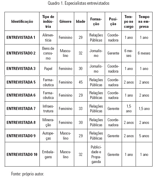 Dados os critérios de seleção e o tempo disponível para o desenvolvimento da pesquisa, fruto de um trabalho de dissertação, chegamos ao número de dez entrevistados, quantidade que avaliamos como suficiente para ampliar a visão do tema estudado e oferecer uma perspectiva prática ao estudo teórico. Dos dez profissionais entrevistados, sete são relações-públicas, dois jornalistas e um publicitário. Seis são mulheres e quatro homens, tendo os entrevistados mais novos 29 anos e a mais velha 45.