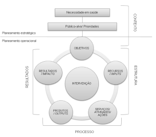 Qualquer intervenção em saúde apresenta alguns componentes básicos, cuja descrição é essencial para o planeamento estratégico e operacional da mesma (Figura 1). Na abordagem da avaliação em saúde importa referir a tríade estrutura, processo e resultados, que englobam os seguintes atributos de uma intervenção: objetivos; recursos (“inputs”); serviços, ações ou atividades; produtos (“outputs”); e resultados (“outcomes”) (5, 10, 13). Cada um destes componentes pode ser alvo de uma avaliação. A avaliação é uma responsabilidade ética e profissional que deve ser incorporada na prática do nutricionista, em qualquer uma das áreas de atuação (9).