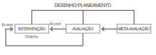 avaliação do planeamento. Quanto ao momento da avaliação, esta pode ser implementada antes do início da intervenção (ex-ante), pode ocorrer durante a sua realização (ongoing/ in itinere), ou pode incidir sobretudo nas dimensões da intervenção, após a execução da mesma (ex-post) (14). A avaliação ex-ante permite aferir se o desenho da intervenção responde ao pretendido e permite mudanças no planeamento, de modo a que este possa ser melhorado. As avaliações ongoing e ex-post fornecem informação sobre as etapas da implementação e dos resultados da intervenção. A avaliação pode, também ela ser alvo de uma avaliação (meta-avaliação), no que respeita à qualidade de todo o processo, ou seja, à verificação da consistência e coerência em relação aos parâmetros que orientam sua boa prática, nomeadamente a sua utilidade, flexibilidade, propriedade e precisão (15, 16).